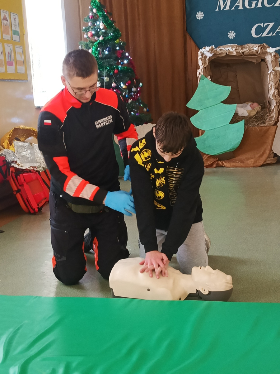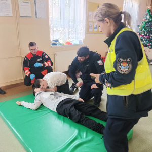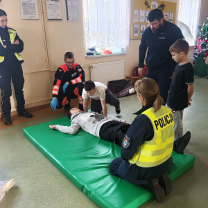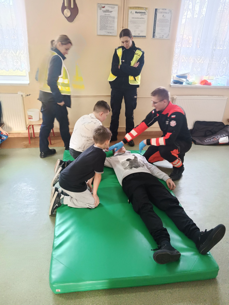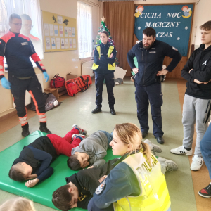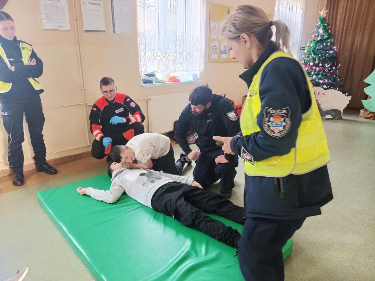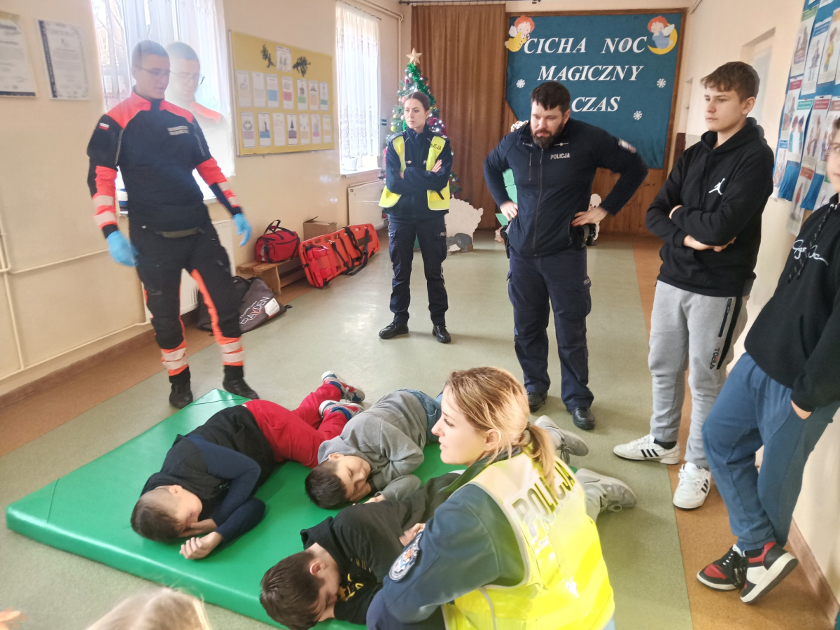 17 grudnia br. w naszej szkole odbyły się warsztaty z zakresu udzielania pierwszej pomocy. Uczniowie spotkali się z dzielnicowym i policjantkami z Komendy Powiatowej Policji w Opolu Lubelskim oraz z ratownikiem medycznym, którzy w ciekawy i praktyczny sposób pokazali, jak reagować w sytuacjach zagrożenia zdrowia i życia. Nie zabrakło ćwiczeń praktycznych, pytań i cennych wskazówek. To była ważna lekcja odpowiedzialności i bezpieczeństwa. Dziękujemy za poświęcony czas i przekazaną wiedzę.