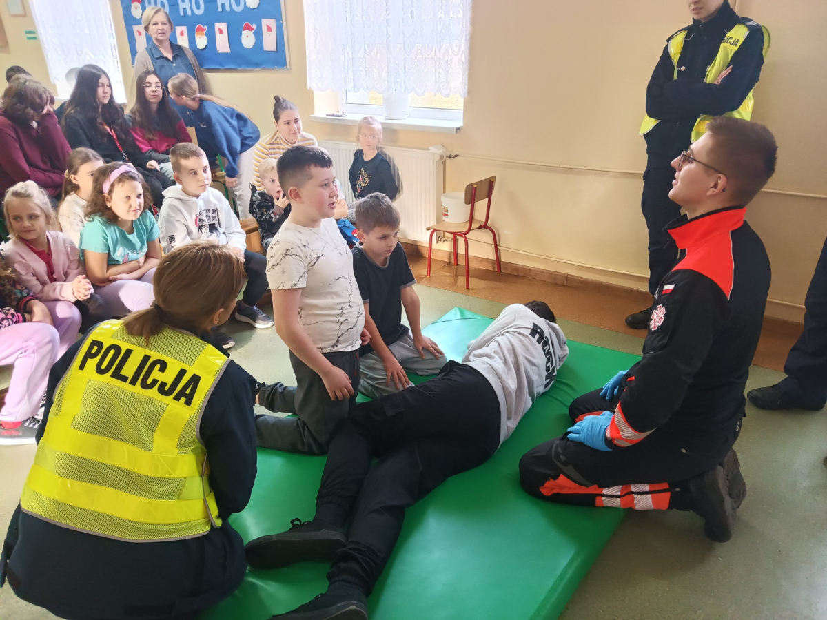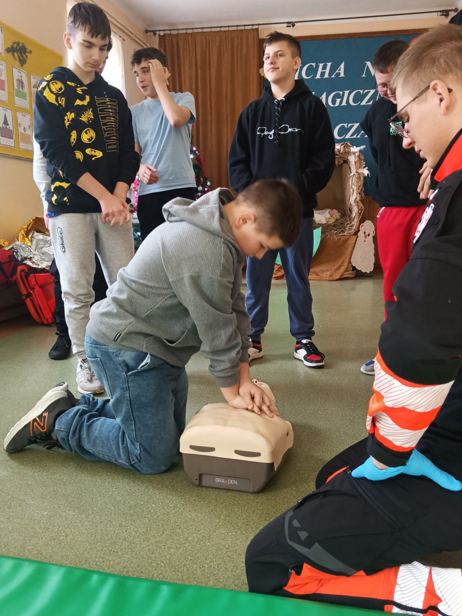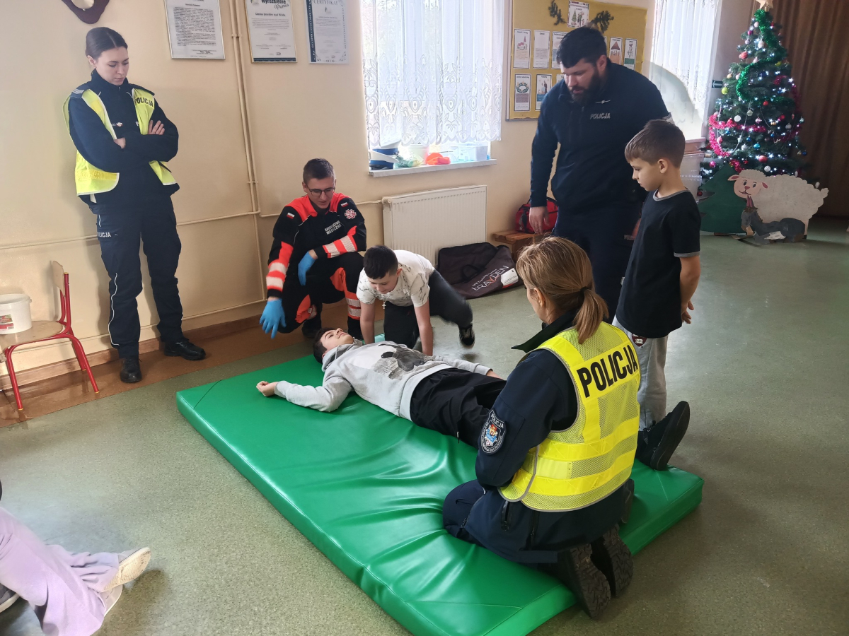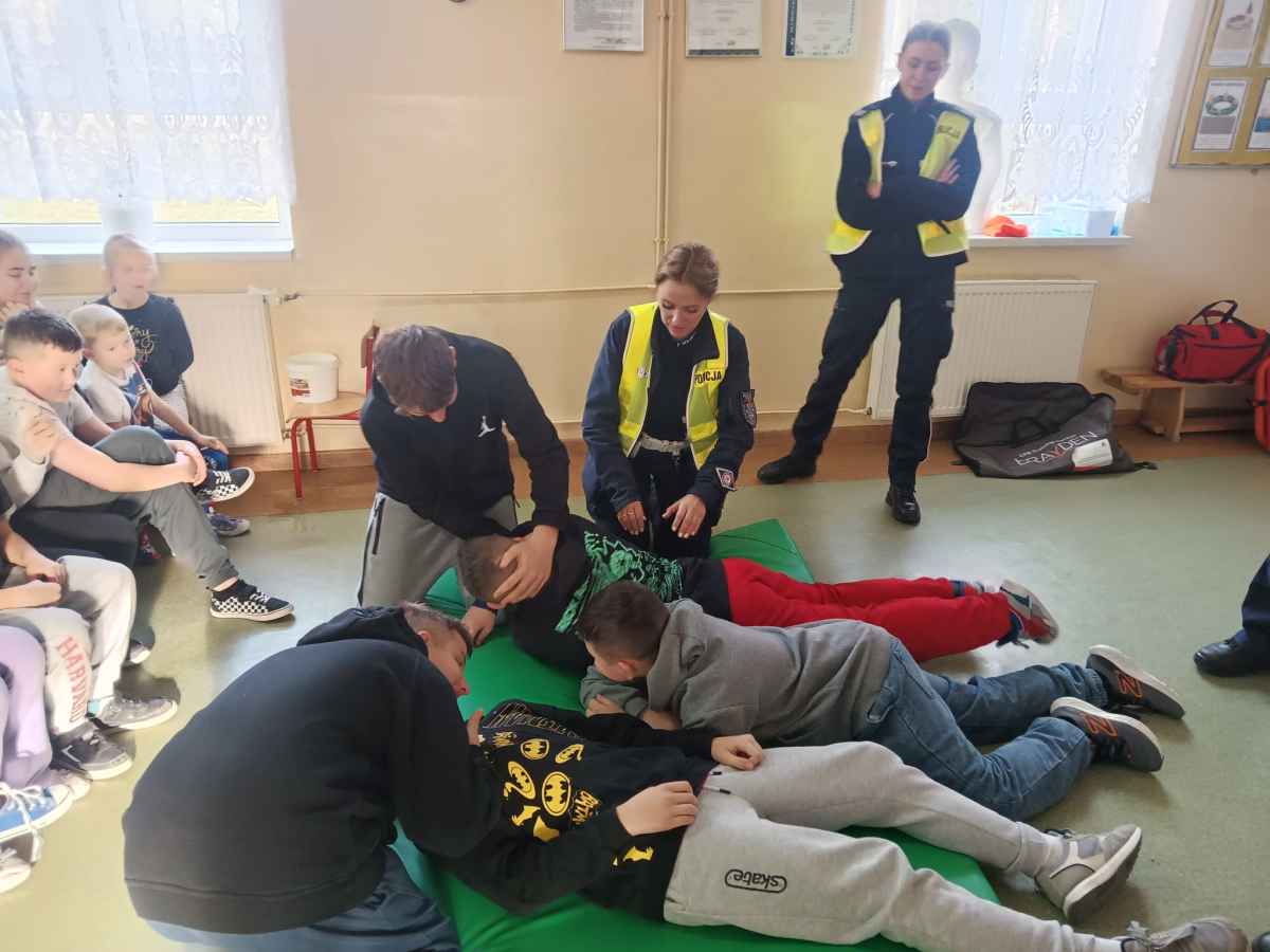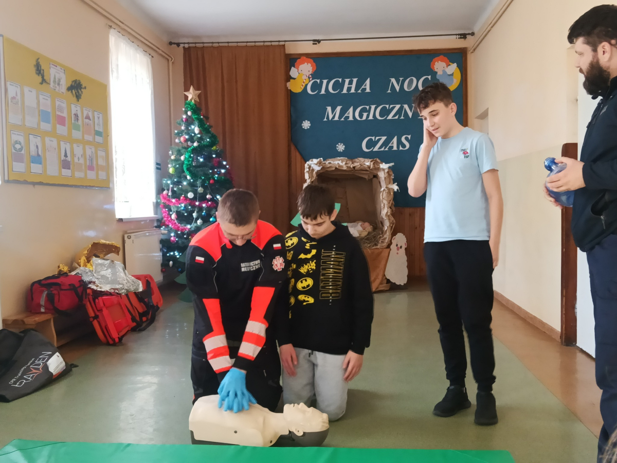 17 grudnia br. w naszej szkole odbyły się warsztaty z zakresu udzielania pierwszej pomocy. Uczniowie spotkali się z dzielnicowym i policjantkami z Komendy Powiatowej Policji w Opolu Lubelskim oraz z ratownikiem medycznym, którzy w ciekawy i praktyczny sposób pokazali, jak reagować w sytuacjach zagrożenia zdrowia i życia. Nie zabrakło ćwiczeń praktycznych, pytań i cennych wskazówek. To była ważna lekcja odpowiedzialności i bezpieczeństwa. Dziękujemy za poświęcony czas i przekazaną wiedzę.